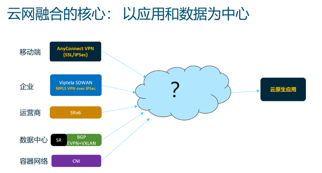 而云网融合的核心是以应用和数据为中心的架构,如何将已有的多种技术组合在一起,更好的给云原生应用服务,这才是下一代网络发展的方向。