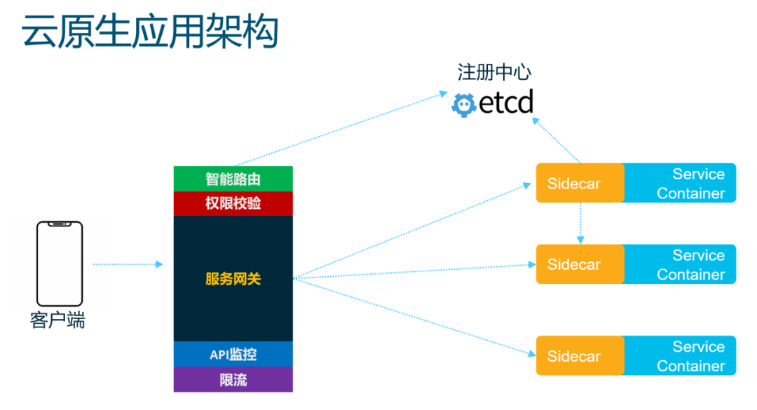 我们先从应用出发, 来看看云原生架构,可以看到API-Gateway到后期的ServiceMesh所使用的Sidecar所涵盖的功能和很多网络设备支持的功能并无太多的差别, 无论是智能路由,分布式负载均衡,还是流量管理,限流熔断,或者超时重试,微服务间的可视化,安全等等,