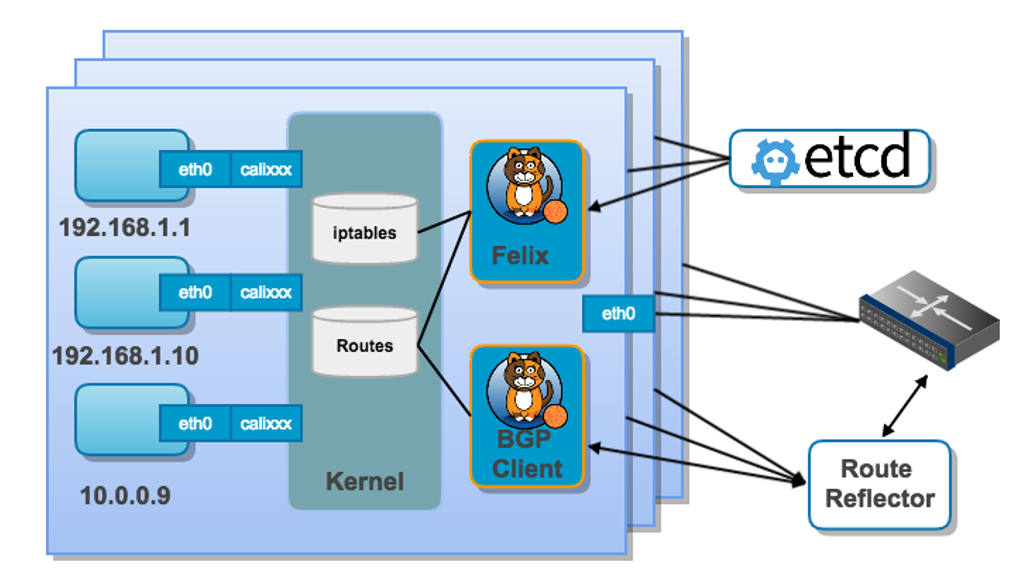 Calico为了和原有的数据中心基础架构整合,采用了BGP协议和Underlay交换机通信,针对较大规模部署时还需要RR. 因此这样的部署对网络拓扑有很强的依赖性,在具有收敛比的常规数据中心架构中,很容易出现拥塞点,但这种以网络为中心的架构在策略灵活性上却无法给应用提供很好的支撑.