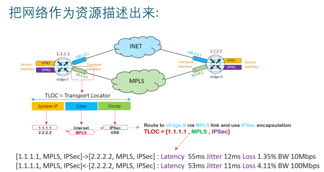 整个网络由多个网络设备多种链路类型构成,那么我们就需要将每个设备后面挂的资源(网段、主机)提供一种寻址的方式。所以无论是思科还是华为在对于资源的描述上都采用类似的做法:Transport Locator(TLOC)。