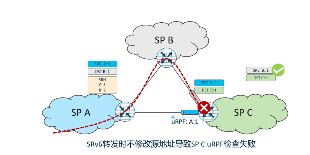 但是为什么不全盘使用SRv6呢?一方面,SRv6由于源地址不更改还存在一些uRPF校验的问题,