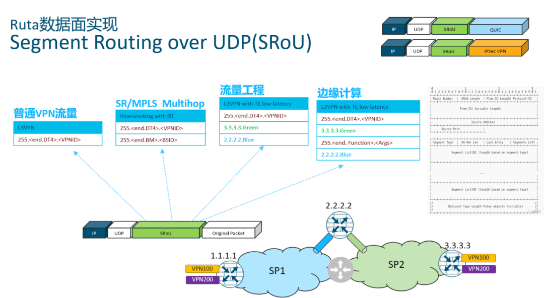 所以Ruta的数据面实现,选择了Segment Routing over UDP的方式,我们新定义了一个SRoU的头,直接放置于UDP载荷中,当然在它也可以嵌入到QUIC