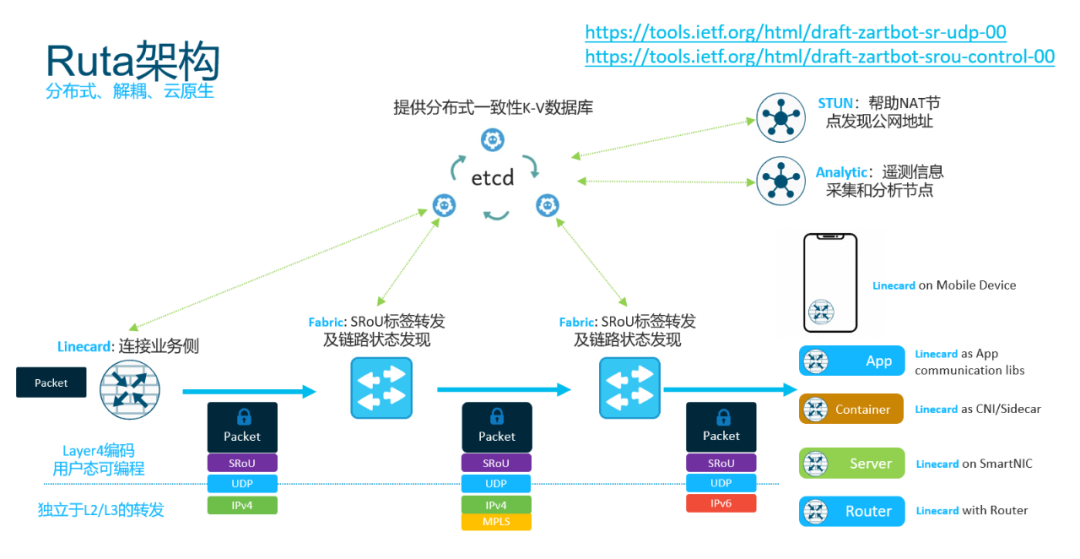 传统的网络转发节点,例如数据中心核心交换机、SDWAN路由器等都可以作为Ruta的Fabric节点,而一些家用路由器或者服务器的智能网卡,或者已有的ServiceMesh的Sidecar,甚至应用本身,都可以扩展出来作为Linecard接入到整个Ruta转发架构中.