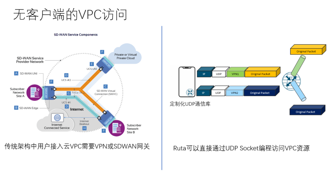 传统架构中,用户接入云VPC需要VPN或者SDWAN网关,而借助Ruta在Userspace的可编程能力,我们可以直接通过定制化的UDP通信库访问云端,甚至可以对QUIC