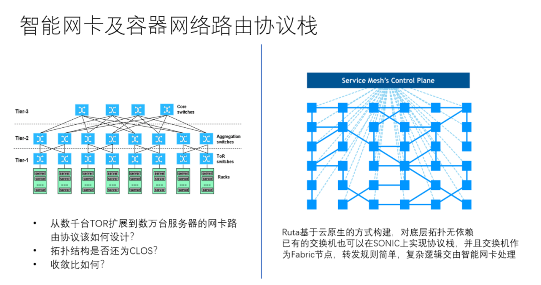 在公有云等超大规模数据中心的部署下,传统的BGP管理数千台TOR交换机已经有些力不从心了,那么当智能网卡和HostOverlay出现以及容器网络的部署,路由协议该如何设计?传统的路由协议也约束了网络拓扑必须为CLOS架构进行负载均衡,并且考虑到成本还设计了3:1或者2:1的收敛比,当东西向流量出现拥塞时难以调度。