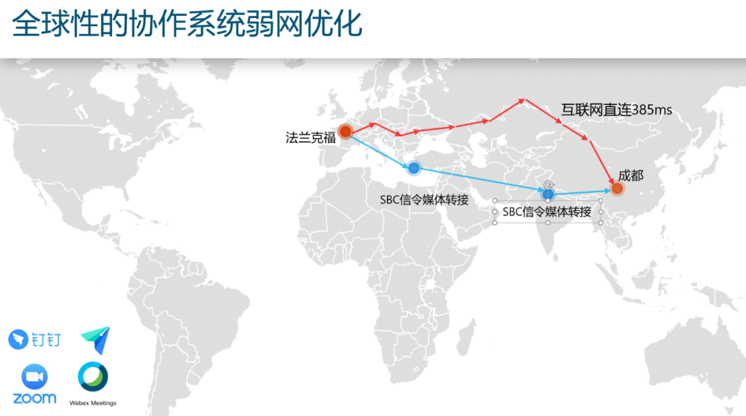 由于疫情的影响,全球性的协作平台需求增长也非常迅速,但是直接通过互联网连接音视频会议体验非常差,这类业务通常需要进行弱网优化,优化过程中有采用SBC进行信令和媒体转接的方式,通常为静态配置的路径,并且每路呼叫都需要维持状态,Scale会非常差,运营成本也非常高