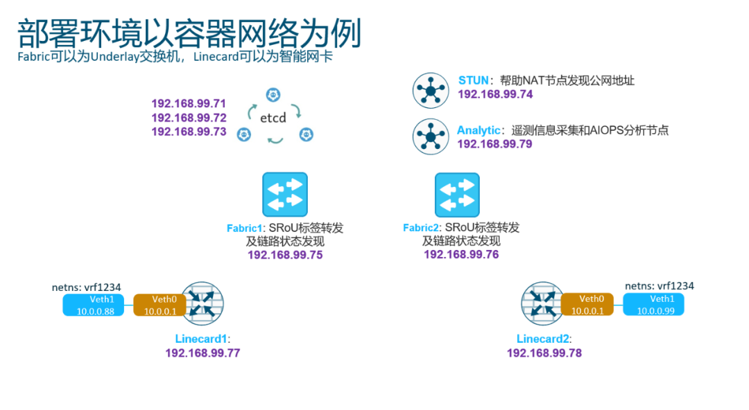 这里我们以一个典型的数据中心Spine-Leaf基础架构和HostOverlay融合的方式进行部署, Fabric1、Fabric2可以为基础架构中的P4交换机,Linecard1、Linecard2可以为智能网卡或者SideCar