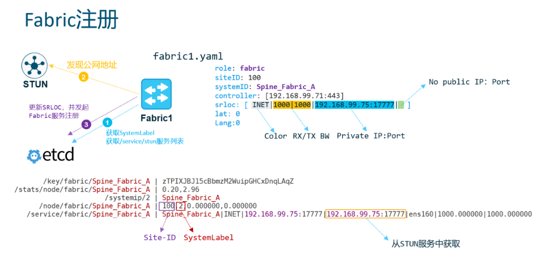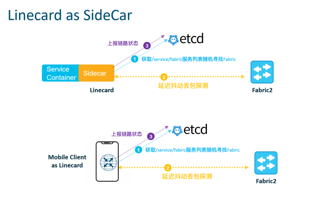 当LineCard为SideCar模式时或者为应用终端时处理更加简单,业务本身是注册到ETCD的,只需要随机寻找Fabric节点(例如地理位置最近的Fabric),把连通Fabric节点的Linkstate和加密密钥上报即可,这样终端应用直接在ETCD中就可以获取可达路径了。