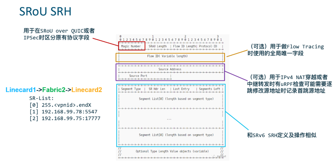 : 这个字段用于头端封装自己的公网地址,或者第一跳Fabric节点帮助将接收到的IP包的公网地址和端口压入这个字段。主要目的是让远端的隧道终点溯源同时执行逆向对称路由或者可优化的非对称路由。第一跳压入还有另一个考虑,在报文中间插入header会是一个非常麻烦的事情,中继Fabric节点如果需要插入源地址信息在UDP头中,如果用DPDK实现则需要把mbuf 拆开,然后insert,或者把很多bytes 前移后移空出一段。而第一跳需要LineCard识别公网也很麻烦,搞STUN代价也有点大,所以第一跳还可以什么都不干,allocate一段source address 空间置0就好,而Fabric节点的第一跳设备可以自动的把源地址源端口拷贝进入这个字段即可。SRH & Function