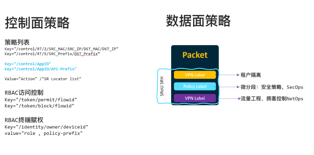 通信上由于采用了TLS连接到ETCD,而且ETCD也有非常完善的RBAC控制, 控制面我们仅需要定义一些策略列表即可,但是转发面基于一些已有的研究,我们需要将报文标记分类三类, 一类是租户隔离信息,另一类是安全相关的Token或者微分段的身份信息,最后是用于最优路径转发的流量工程信息: