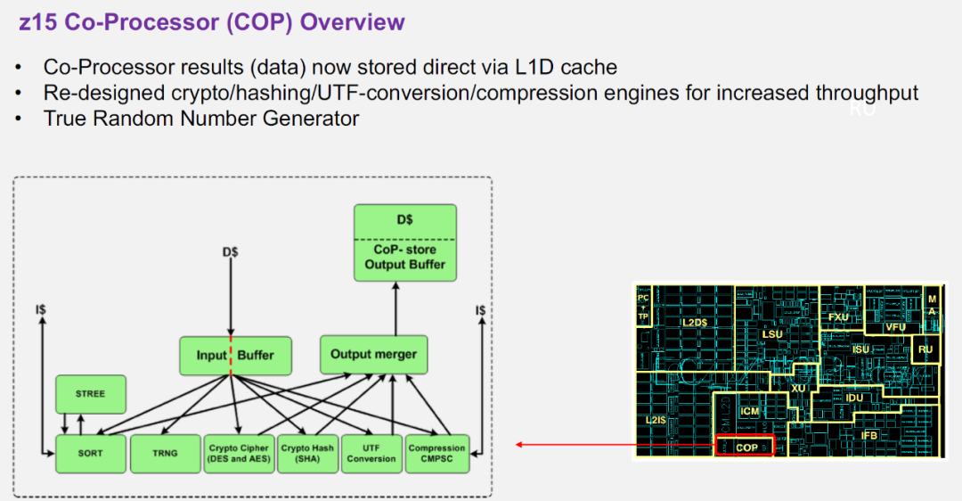 IBM大机上为了加速处理器的吞吐,尝试着使用各种加速引擎,最终在z15上这些协处理器被整合进了CPU: