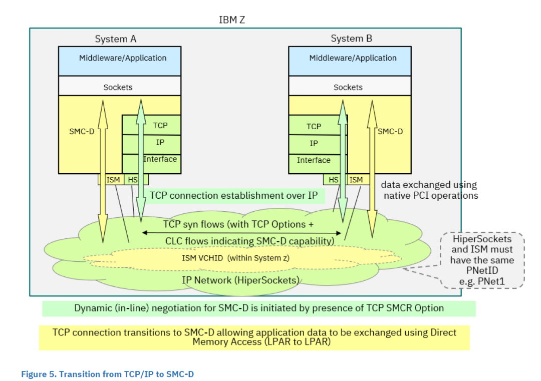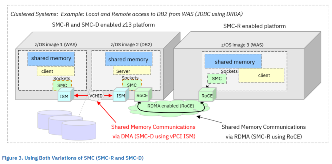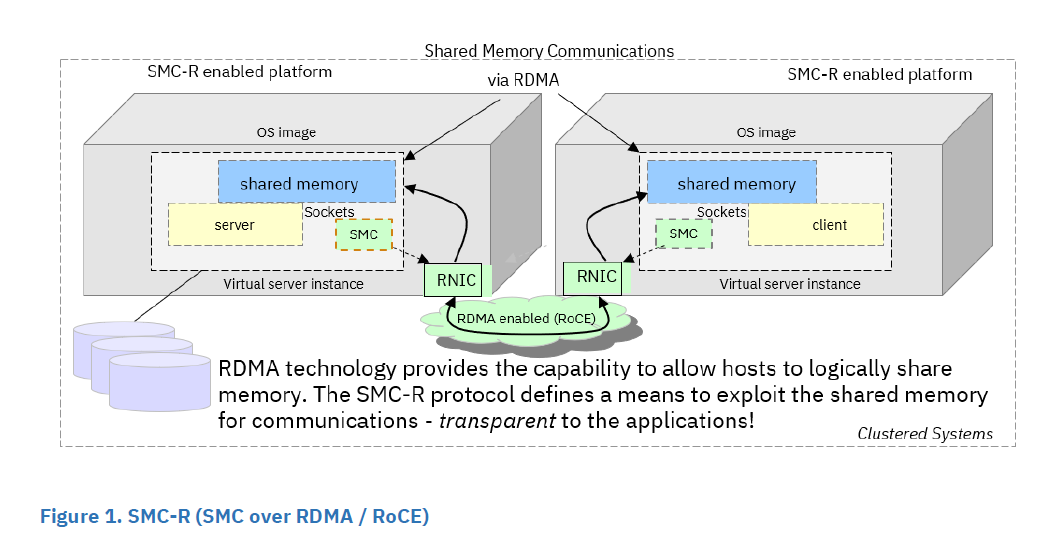 大型机共享内存的处理方式也是值得我们借鉴的,IBM SMC(Shared Memory Communications)支持多种模式,首先是SMC-R, R自然代表的是RDMA.