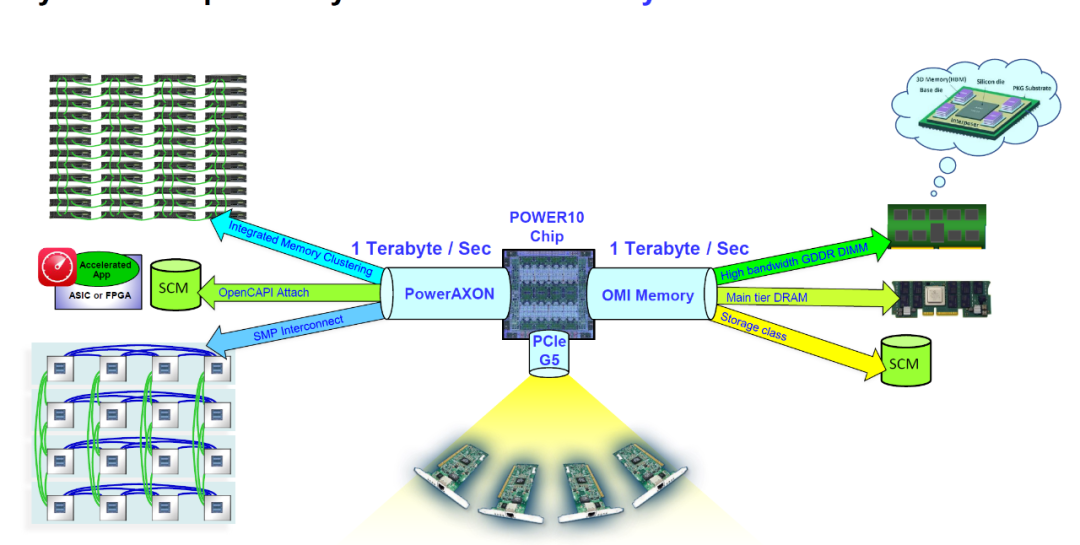从架构上而言,L3和片上I/O子系统的设计非常有趣, 而更有趣的是PowerAXON总线构建的SMP互联,和OMI内存结构