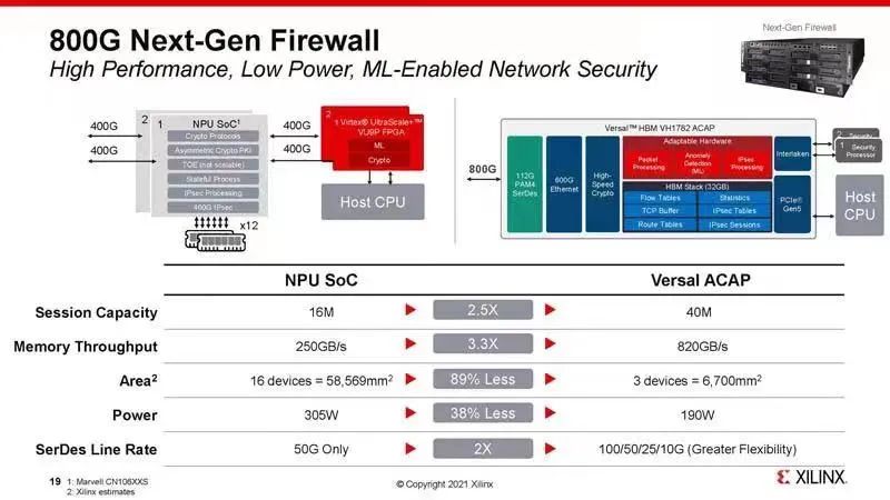 Xilinx最近很有趣的发了一个图,左边的NPU SoC就是CN106XXS,右边是带HBM的Versal,其实两家都有自己很好玩的东西,Marvell是ARM多核跑DPDK可以和主CPU软件架构上同构,这样在小于200Gbps的边缘和中档次场景中是一个很好的选择。而Xilinx新的FPGA有600G Ethernet的硬核也是一个很不错的选择,不过正如它自己的定位,更多的还是在大于200Gbps以上的高端高吞吐市场上做网络相关的处理。