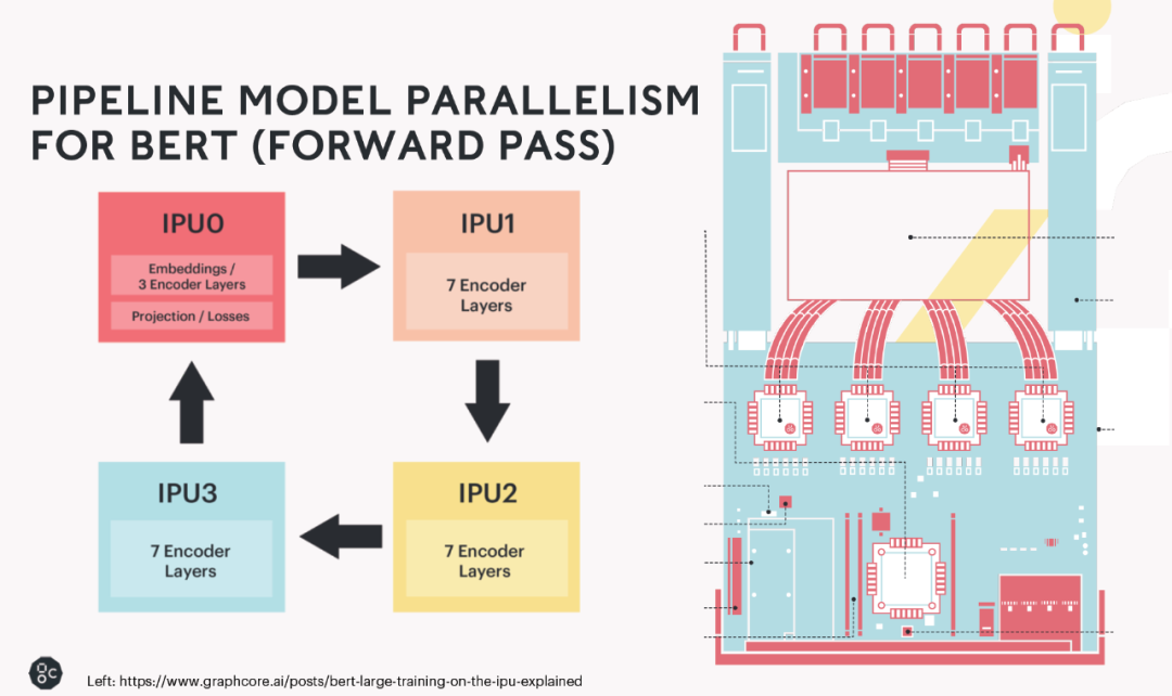 又是一个值得考虑的地方,所以GraphCore采用了PCB上互联,并构建模型不同层,让训练数据在一个PCB内多块IPU上流动: