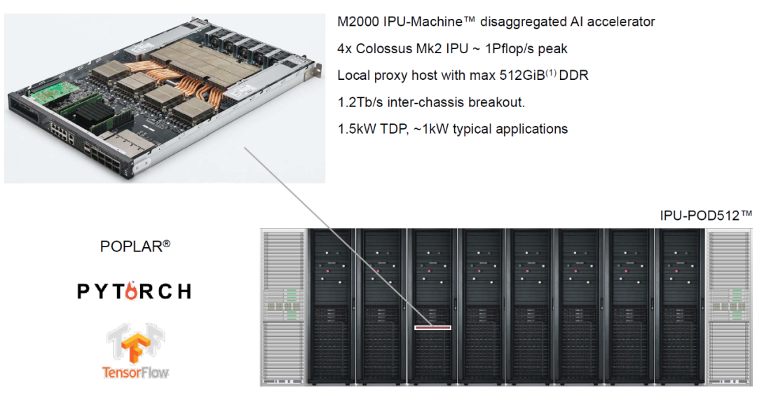 Graphcore也发布了第二代处理器并把整个集群的规模扩展到了512个节点,每个1U的节点通过大量的QSFP28接口互联