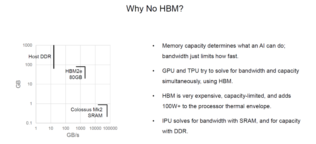 GraphCore的架构上对比WaferScale已经没有太多的新意,但是有几个地方值得注意的是,片内大量的SRAM配合DDR比HBM好: