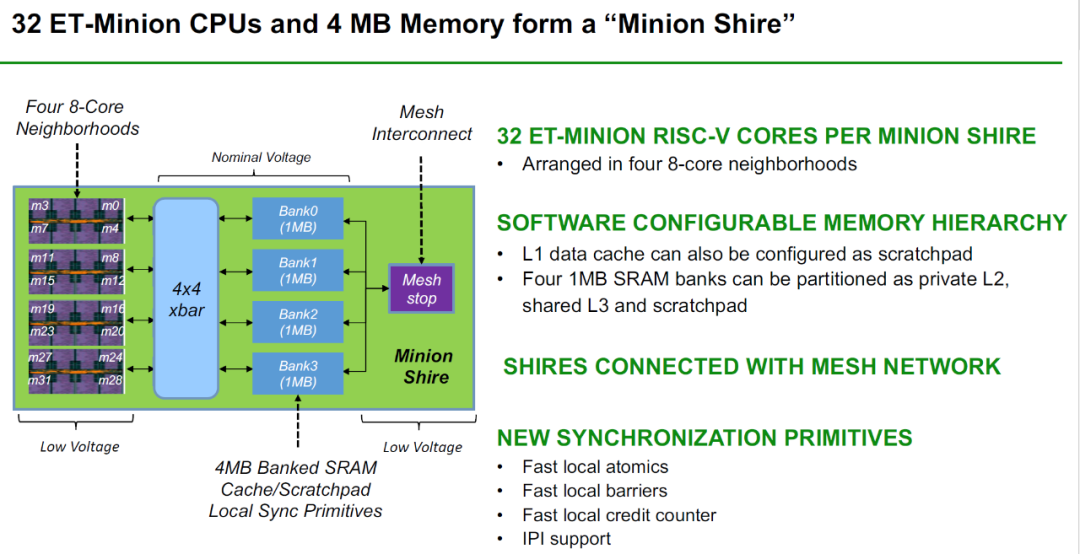 基于RISC-V的核心,然后8个Core构成一个Cluster,然后4x4的Xbar互联构成一个Tile,最后通过一个2D-Mesh连接到外面其它Tile: