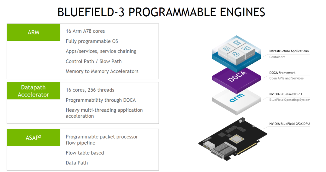 但是缺点也很明显, 和DOCA的编程能力如何?总体来说这样渐进式的架构还是很不错的,最下面有Stateless的 pipeline可编程处理器,中间有大量的DOCA做多线程加速,而控制面用16个A78也凑合,毕竟N1和N2还是很贵的.