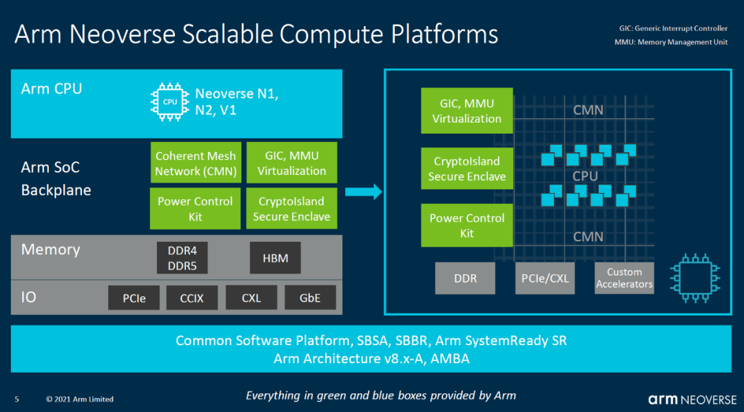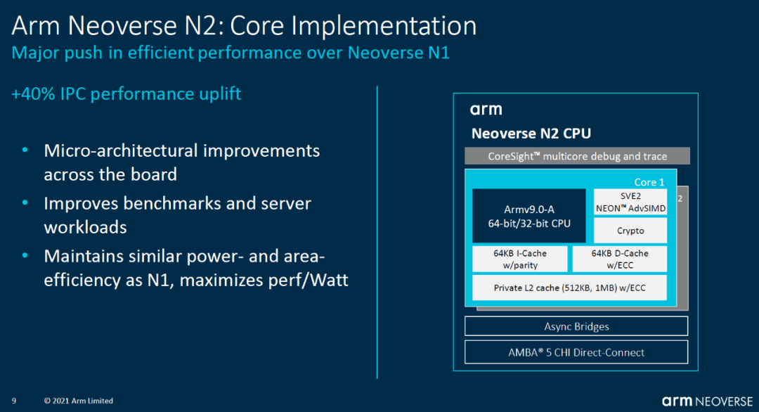N2的单核性能比N1提升了40%,伴随着SVE2指令的支持可以灵活的处理多种业务,当然还有一个非常重要的因素是它的片上网络,这样就可以很容易的添加各种协处理器和加速器以及灵活配置多种类型的总线.