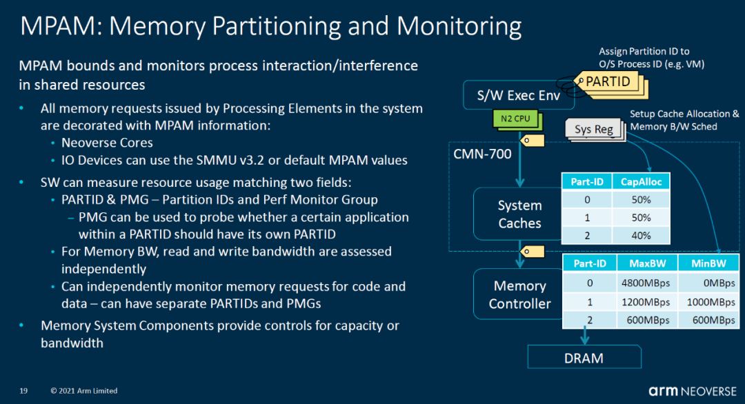 针对多核任务,MPAM可以让内存控制器对不同的PartID采用不同的QoS调度,这样针对一些网络相关的应用场景,例如大象流和大量老鼠流的场景就可以通过一些巧妙的设计规避掉Cache的一些问题