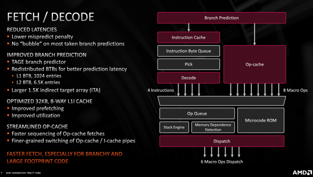 从处理器前端来看, 主要的优化就是降低Fetch和Decode延迟,同时增强分支预测的能力,然后更快的I-Cache reorder,主要是现代程序越来越大