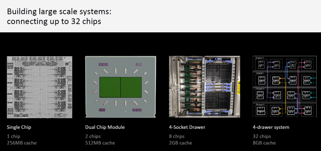 但是可以构成一个32chips的4-Drawer系统,最大的变化是原来的一个负责Drawer和处理器互联的System Controller没了,从画的线来看,似乎变成了类似于3D-Torus Ring的结构.