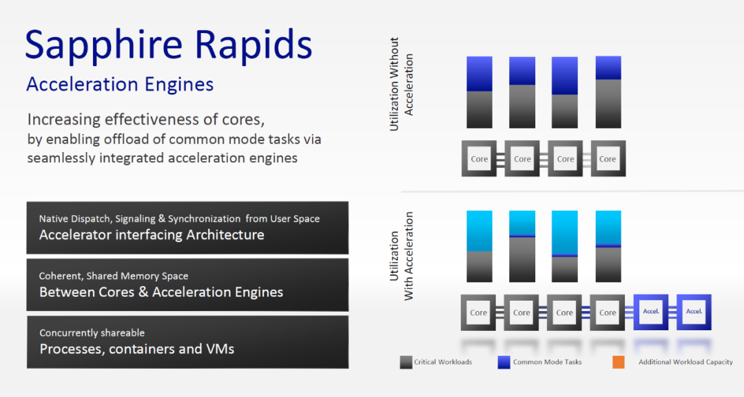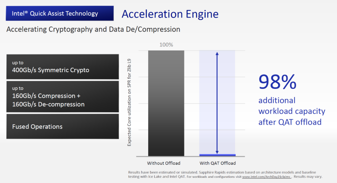 从微架构上而言,这个小家伙很好的帮助了CPU在I/O密集型应用场合下的内存搬运操作, 同时QAT也整合进去,这样支持400Gbps的加密或者160Gbps的压缩、解压缩。所以我一直跟很多做DPU的说,这些东西迟早都会被收拾进CPU的,你们看这不Intel也跟进了么。