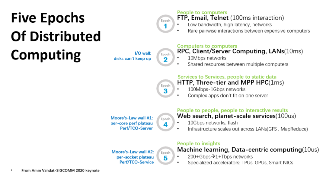 在这个过程中又遇到了摩尔定律的另一堵墙,核数量、Cache size、片上网络和功耗的限制使得多核处理器发展也遇到了瓶颈。当然可以靠堆一系列资源也可以解决一些问题,但这样又面临着成本的压力。正如Amin在第五代分布式计算架构所述,核心是由于摩尔定律受限于单个Socket处理器上的处理能力,因此整个系统更多的要从如何低成本交付服务