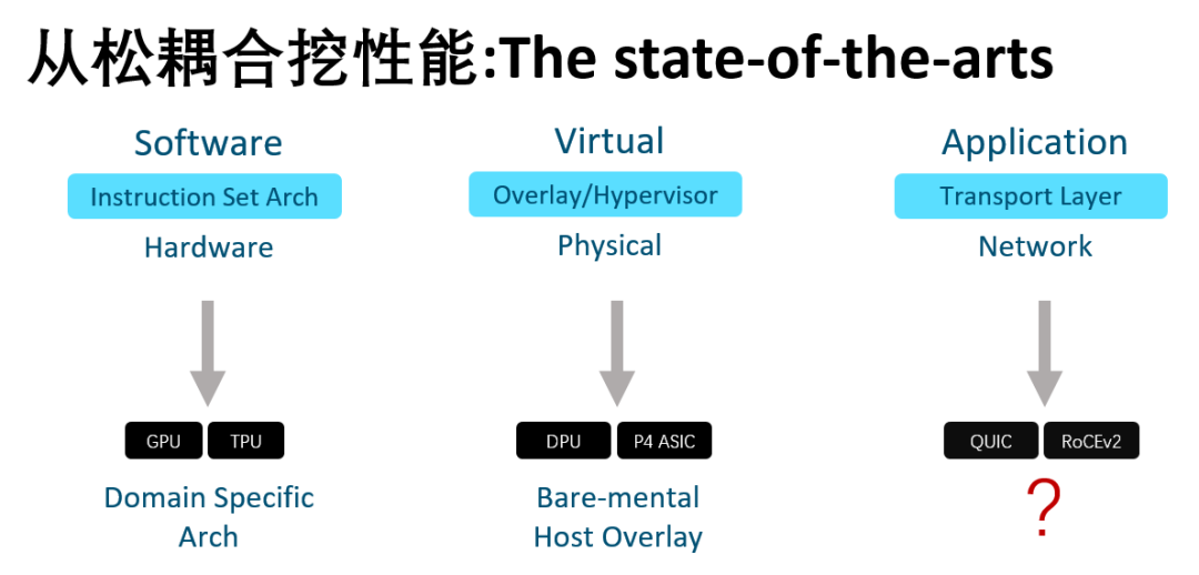 的解决方案来获得性能的提升。智能网卡提供了一些基本的连通性加速和批量数据解析、加解密、可靠传输等工作负载的加速,这些数据处理业务固然重要。但它并不是全部,紧耦合需要发生在一切有可能发生的地方,并且要以数据为中心,围绕着数据构建一个平衡的分布式系统才是第五代分布式计算架构的核心。