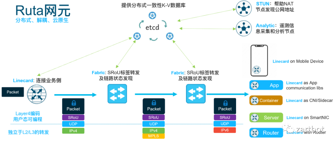 NetDAM在Fabric通信上使用了Ruta解决方案,这是我们在2020年的一项工作,即Fabric可以通过主动测量延迟和丢包数据并将链路状态和节点信息放置于ETCD中: