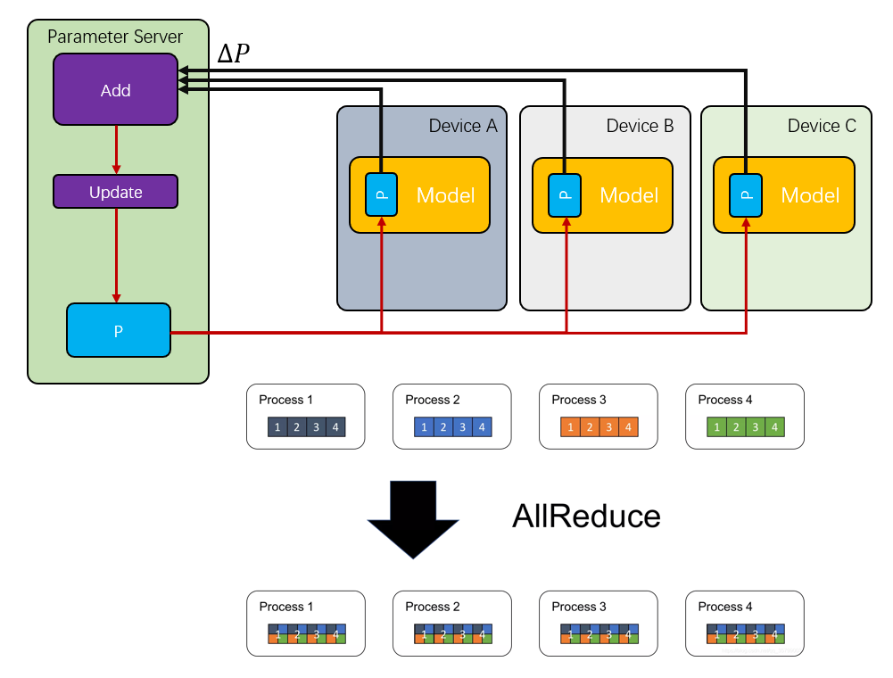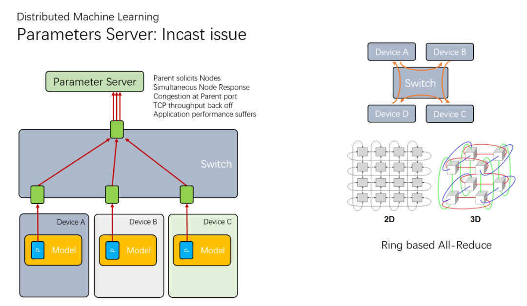 最开始的时候,是采用一个集中式的参数服务器(Parameter Server)构建,但是很快就发现它成了整个集群的瓶颈,然后又有了一些环形拓扑的All-Reduce