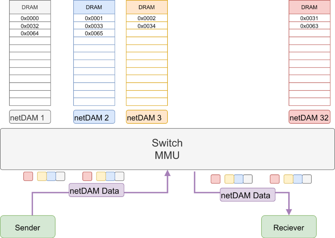 针对大象流的通信是一个非常难的话题,大象流的持续时间长,带宽占用大,而且按照传统的TCP的方式无法多路径打散,但是既然它持续时间长,那么就延迟不敏感,稍微增加一些store-load的延迟只要能够保证Pipeline能让收端带宽跑满即可,基于这种思路那么就可以玩Mempool了,例如昨天写道的Mempool架构,我们可以通过交换机虚拟一个IP地址,然后根据UDP内不同的NetDAM内存地址让交换机做MMU去路由: