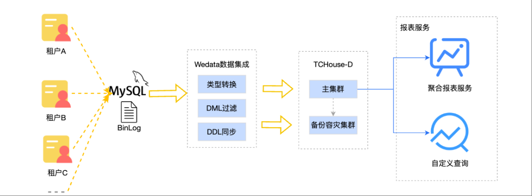 源端 MySQL 数据经过 WeData 的数据集成进行自动数据转换后,入库到 TCHouse-D 中进行聚合分析和实时自定义分析。另外为保障数据安全,针对关键业务还创建了主备集群进行容灾,若主集群发生业务问题,可快速切换至备集群,避免长时间业务影响。