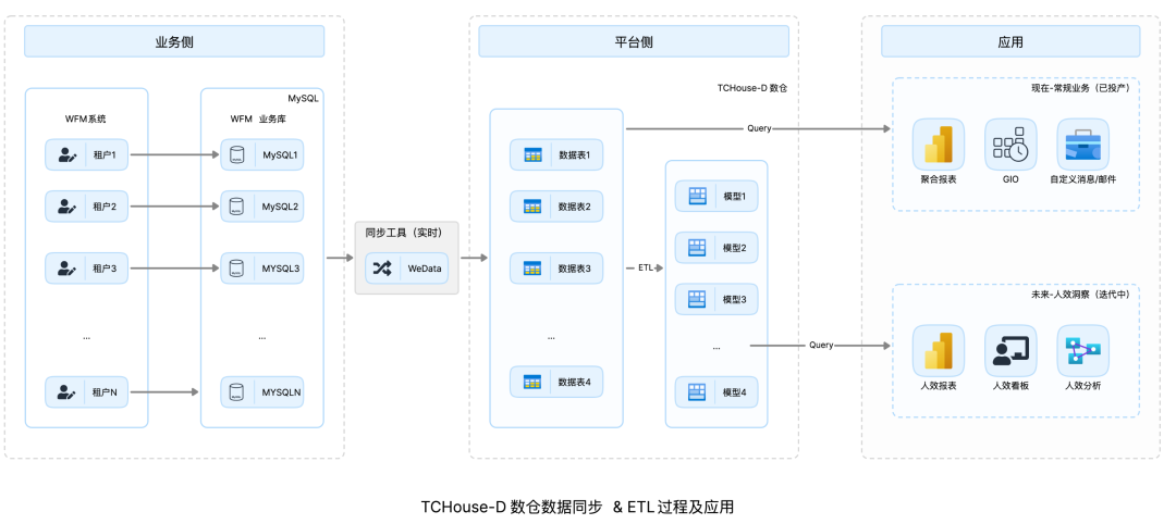 基于以上优势,盖雅最终选择与腾讯云大数据合作,并采用腾讯云数据仓库 TCHouse-D + 腾讯云 WeData 来搭建新的实时报表体系,架构如下: