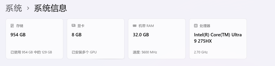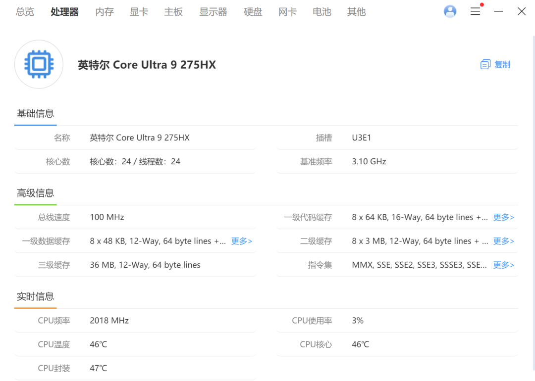 处理器 Intel(R) Core(TM) Ultra 9 275HX 2.70 GHz机带 RAM 32.0 GB (31.4 GB 可用)系统类型 64 位操作系统, 基于 x64 的处理器笔和触控 没有可用于此显示器的笔或触控输入