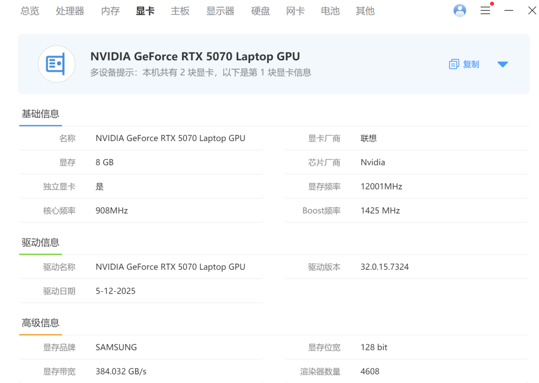 显卡:NVIDIA GeForce RTX 5070 Laptop GPU[基础信息] ----------------------------------------------------------------------------------名称 NVIDIA GeForce RTX 5070 Laptop GPU显卡厂商 联想显存 8 GB芯片厂商 Nvidia独立显卡 是显存频率 12001MHz核心频率 908MHzBoost频率 1425 MHz[驱动信息] ----------------------------------------------------------------------------------驱动名称 NVIDIA GeForce RTX 5070 Laptop GPU驱动版本 32.0.15.7324驱动日期 5-12-2025[高级信息] ----------------------------------------------------------------------------------显存品牌 SAMSUNG显存位宽 128 bit显存带宽 384.032 GB/s渲染器数量 4608