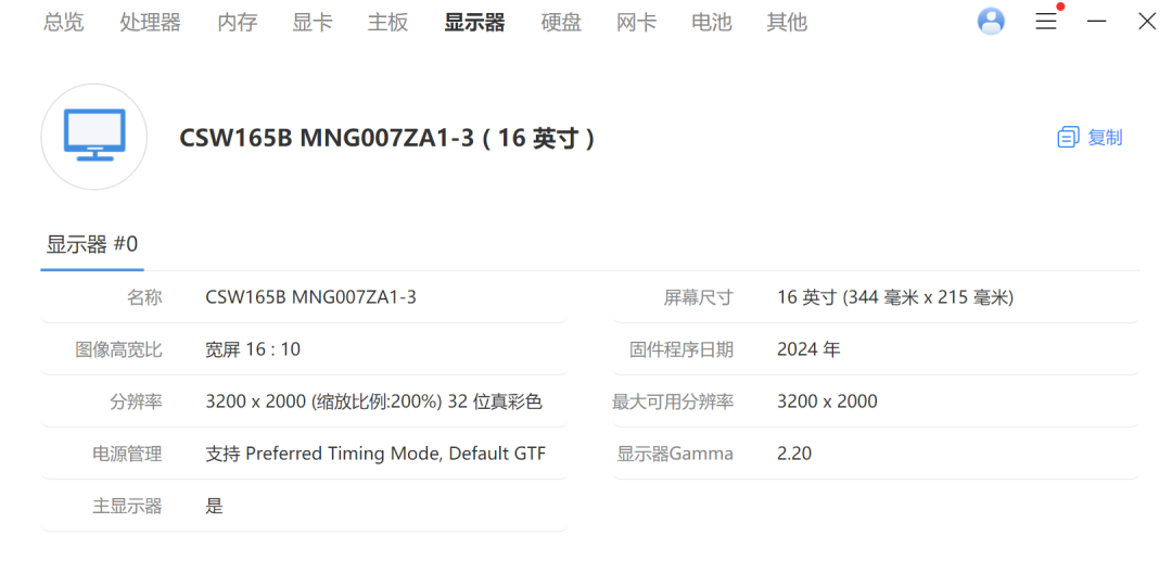 显示器:CSW165B MNG007ZA1-3 ( 16 英寸 )[显示器 #0] ----------------------------------------------------------------------------------名称 CSW165B MNG007ZA1-3屏幕尺寸 16 英寸 (344 毫米 x 215 毫米)图像高宽比 宽屏 16 : 10固件程序日期 2024 年分辨率 3200 x 2000 (缩放比例:200%) 32 位真彩色最大可用分辨率 3200 x 2000电源管理 支持 Preferred Timing Mode, Default GTF显示器Gamma 2.20主显示器 是