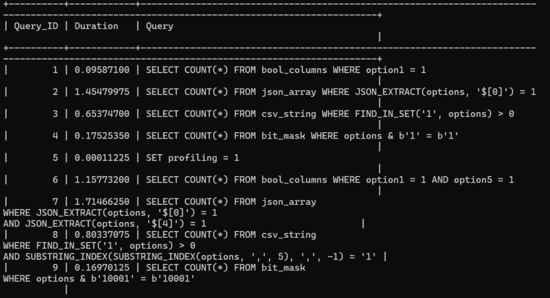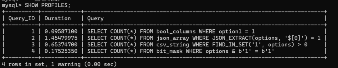 -- 启用性能分析SET profiling = 1;-- BOOL方案SELECT COUNT(*) FROM bool_columns WHERE option1 = 1;-- JSON方案SELECT COUNT(*) FROM json_array WHERE JSON_EXTRACT(options, '$[0]') = 1;-- CSV方案SELECT COUNT(*) FROM csv_string WHERE FIND_IN_SET('1', options) > 0;-- BIT方案SELECT COUNT(*) FROM bit_mask WHERE options & b'1' = b'1';-- 查看耗时SHOW PROFILES;