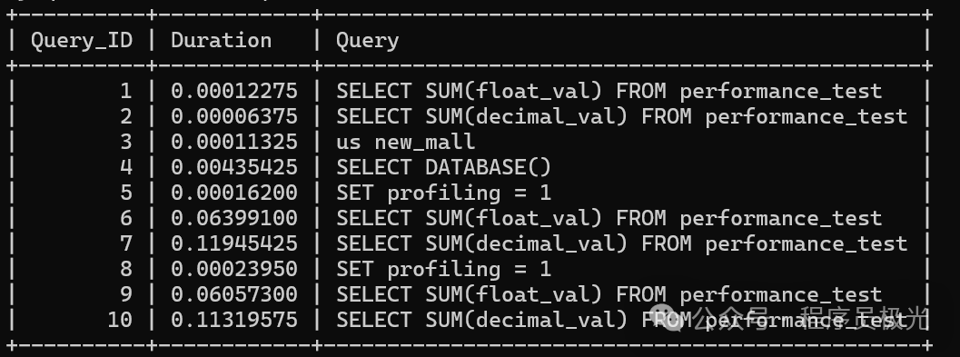 -- 启用性能分析SET profiling = 1;-- 执行查询SELECT SUM(float_val) FROM performance_test;SELECT SUM(decimal_val) FROM performance_test;-- 查看耗时SHOW PROFILES;