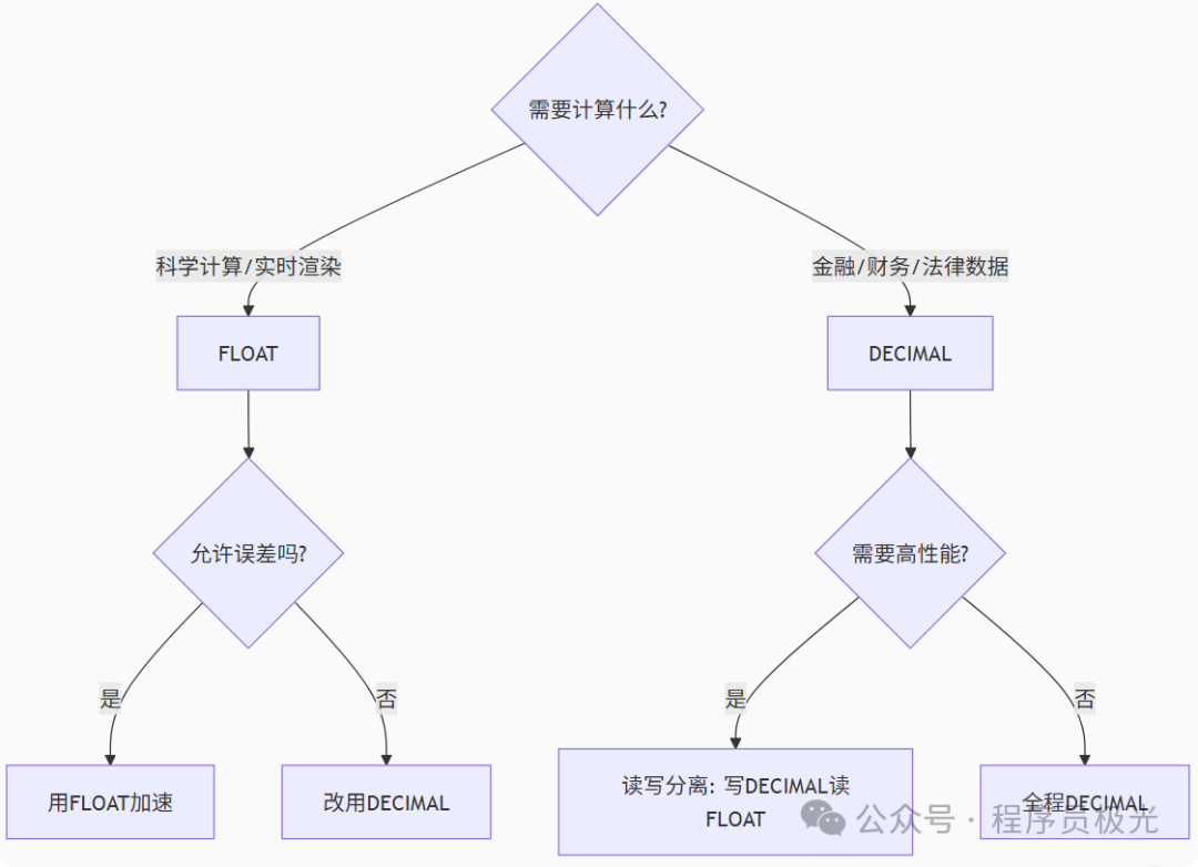 (1) 二进制浮点数的致命缺陷精度丢失:FLOAT/DOUBLE 的二进制表示无法精确存储十进制小数(如 0.1),导致累加误差。