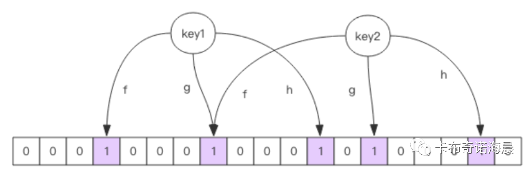 向布隆过滤器中添加key时,会使用多个hash函数对key进行hash算得一个整数索引值然后对位数组长度进行取模运算得到一个位置,每个hash函数都会算得一个不同的位置。再把位数组的这几个位置都置为1就完成了add操作。