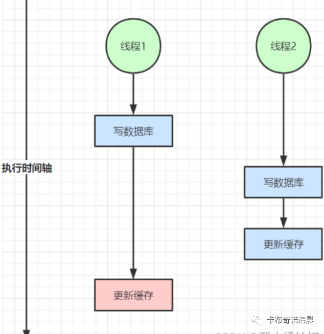 就是你写完数据之后,加上缓存,如果有两个线程并发去更改数据,正常来讲谁先去更改数据库,谁就先去更改缓存,但是因为网络原因造成线程1写完之后还没来得及去更改缓存,线程2执行完更改数据库和缓存,这时线程1去更新缓存,这样就不对了