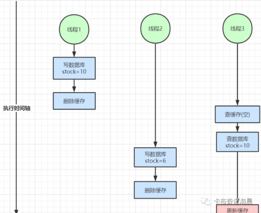 下图的过程是这样,线程1先去更新数据库为10,删除缓存,然后线程3去获取数据,缓存中没有去查数据库是10,准备更新缓存的时候,线程2开始执行, 设置数据,删除缓存(此时也没有缓存),这个时候线程3再去设置缓存为10的话,这样也不对