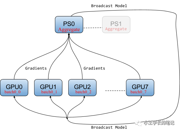 在Parameter server架构(PS架构)中,集群中的节点被分为两类:parameter server和worker。其中parameter server存放模型的参数,而worker负责计算参数的梯度。在每个迭代过程,worker从parameter sever中获得参数,然后将计算的梯度返回给parameter server,parameter server聚合从worker传回的梯度,然后更新参数,并将新的参数广播给worker。