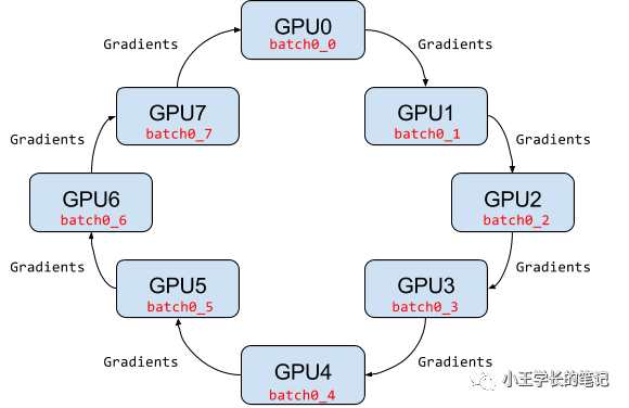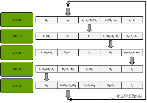 Scatter Reduce过程:首先,我们将参数分为N份,相邻的GPU传递不同的参数,在传递N-1次之后,可以得到每一份参数的累积(在不同的GPU上)。