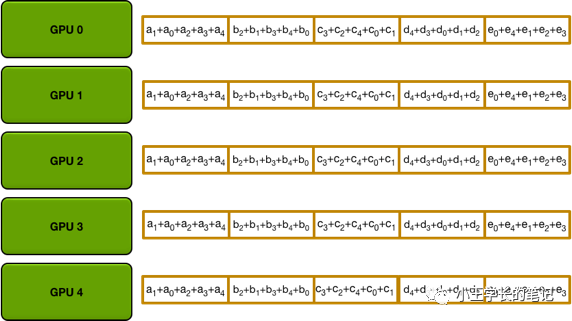 All Gather:得到每一份参数的累积之后,再做一次传递,同步到所有的GPU上。