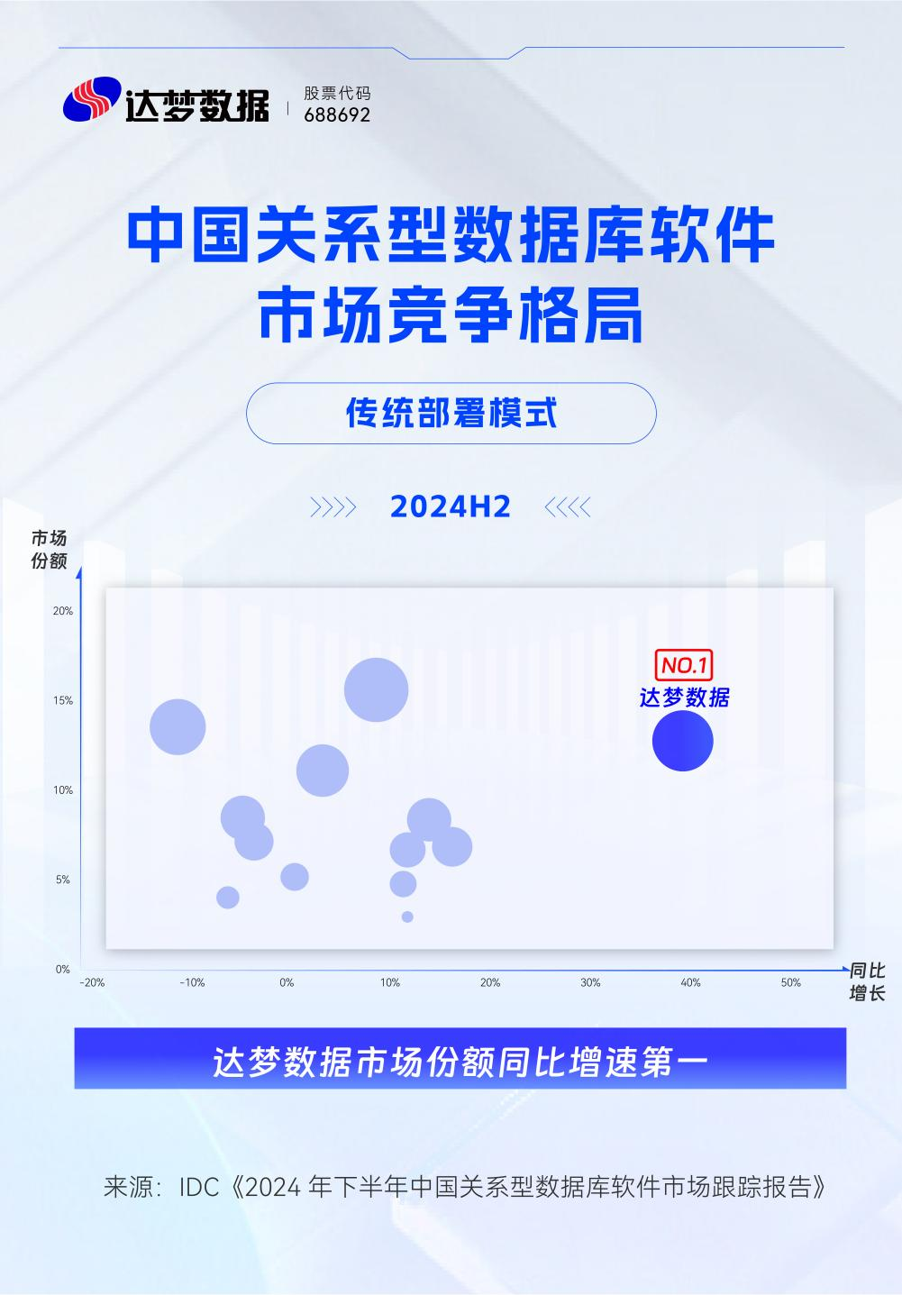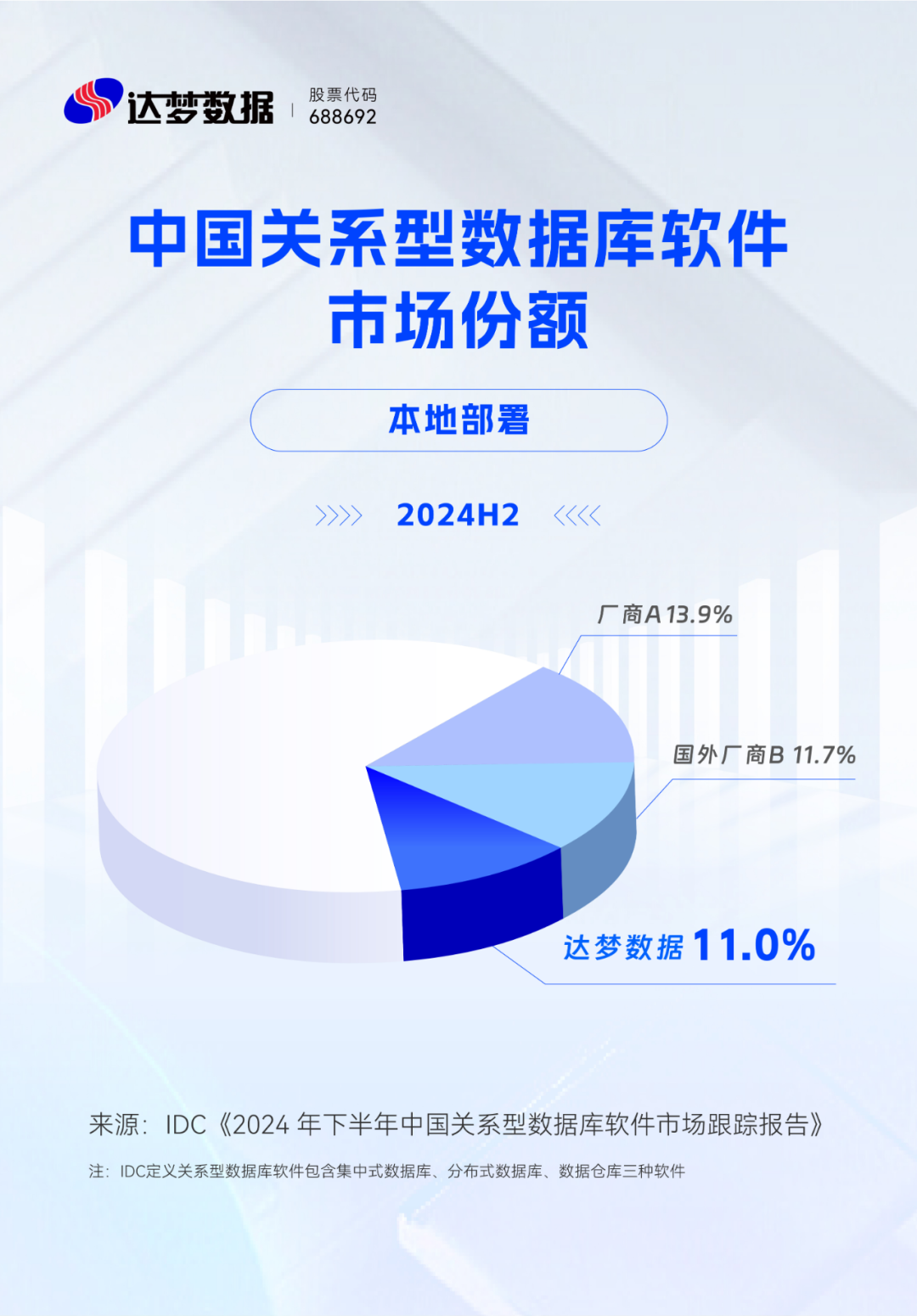 近日,权威研究机构IDC发布了《2024年下半年中国关系型数据库软件市场跟踪报告》,达梦数据再次以卓越表现跻身全球前列,稳居中国市场核心地位。报告数据显示,在传统部署模式中,达梦数据市场份额同比增速第一!2024下半年中国关系型数据库软件市场本地部署厂商中,位列国产数据库厂商第二!