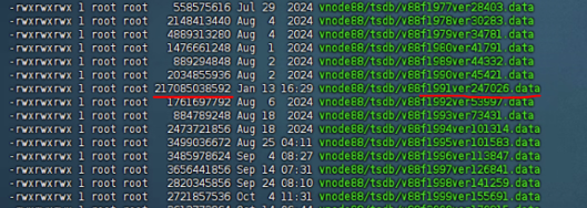 2. 经过检查文件编号和更新日期,发现某单个数据文件大小和写入日期异常,可以判断是应用侧写入了大量历史数据,导致存储放大。