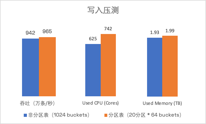 我们基于淘宝真实业务数据,对多级分区表的写入与读取性能进行了系统性压测,验证了分区裁剪能力的实际效果。测试对比了非分区表与分区表(共自动创建 20 个分区)在流式写入场景下的吞吐表现。结果显示:两者在写入吞吐和资源消耗上差异极小。表明多级分区与动态分区创建机制并未对写入性能造成明显影响。